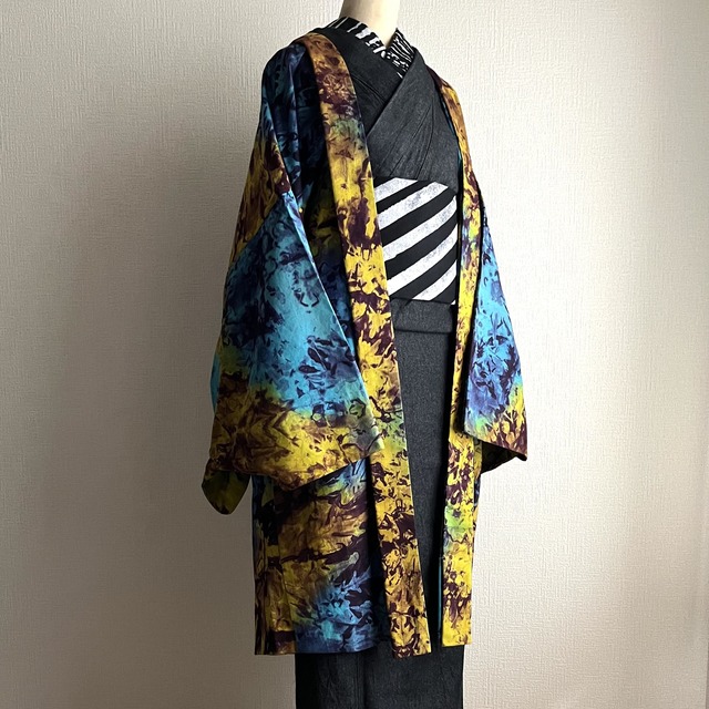 西アフリカ・ガーナの伝統的なタイダイ染で仕立てた古くて新しい羽織のカタチ メンズライクなお仕立てのゆったりとした仕上がりのデザインです ご検討・ご購入の際には必ず以下のサイズをご確認下さい ◆Lサイズ(男女兼用) 身丈 100cm 肩幅 38cm 袖丈 50cm 前幅 23cm 袖幅 38cm 後幅 32cm ※男物仕立て仕様の羽織紐通し(乳)となっております。女物の羽織紐がサイズ的に通しにくい場合は、羽織カン(羽織専用S字フック)をご使用いただくか、クリップタイプの羽織紐をご利用ください ◆仕様 ・綿100% タイダイ染め (ガーナ製) ・手縫い・ミシン併用 (日本国内縫製) ◆発送について コンパクトにたたんだ状態の簡易包装でお届けします (クロネコヤマト宅急便) ◆お手入れについて ・色落ちの可能性を考慮し、洗濯時には他の衣類と分けてお洗い下さい ・たたんだ状態の着物を洗濯ネットに入れ、おしゃれ着用洗剤で押し洗い下さい ・日陰干し下さい ・半乾きの状態でアイロンをかけますとシワが取れやすく、きれいに仕上がります ◆返品・返金について ご購入確定後の返品・返金を致しかねますことをあらかじめご了承頂きますようお願い申し上げます。