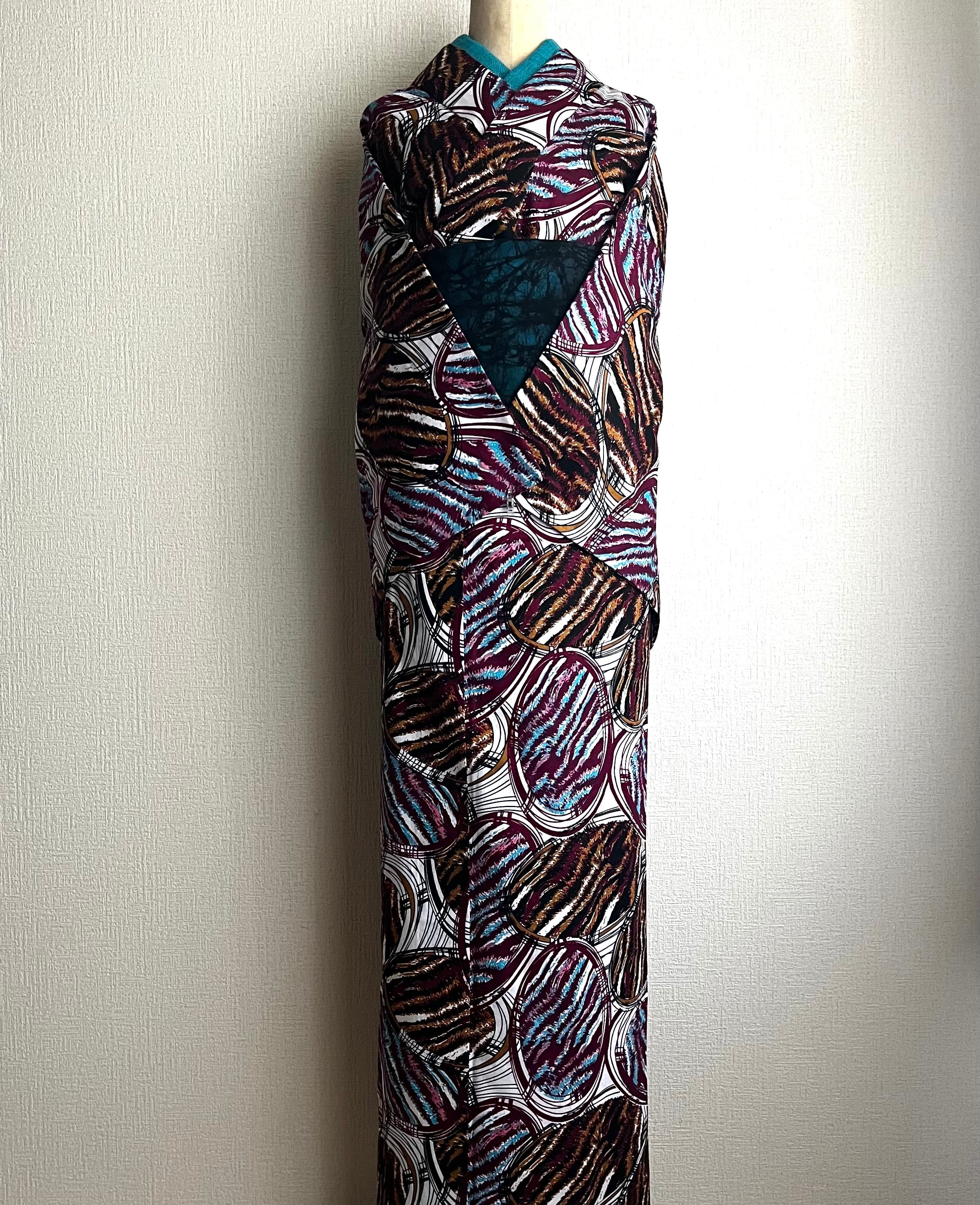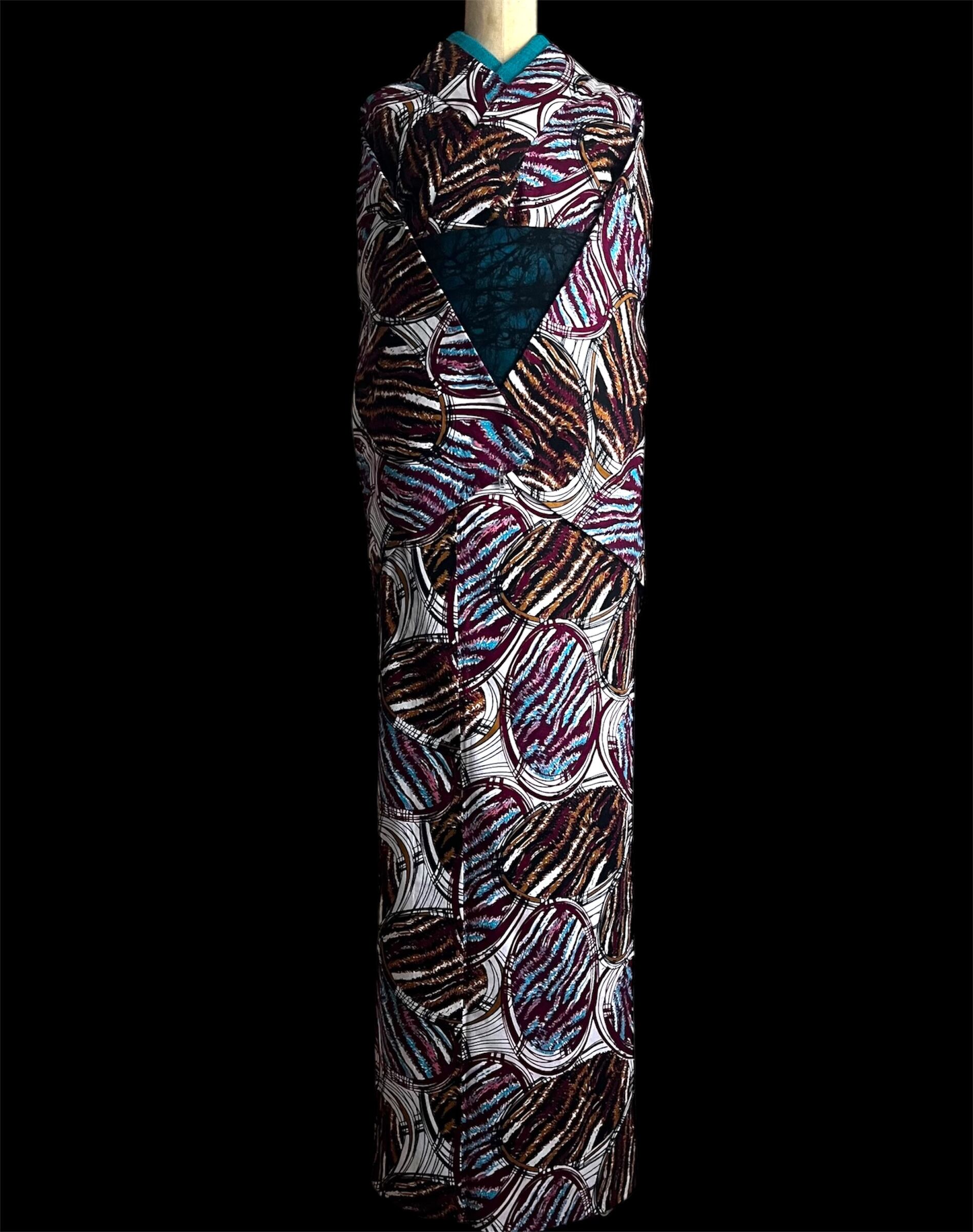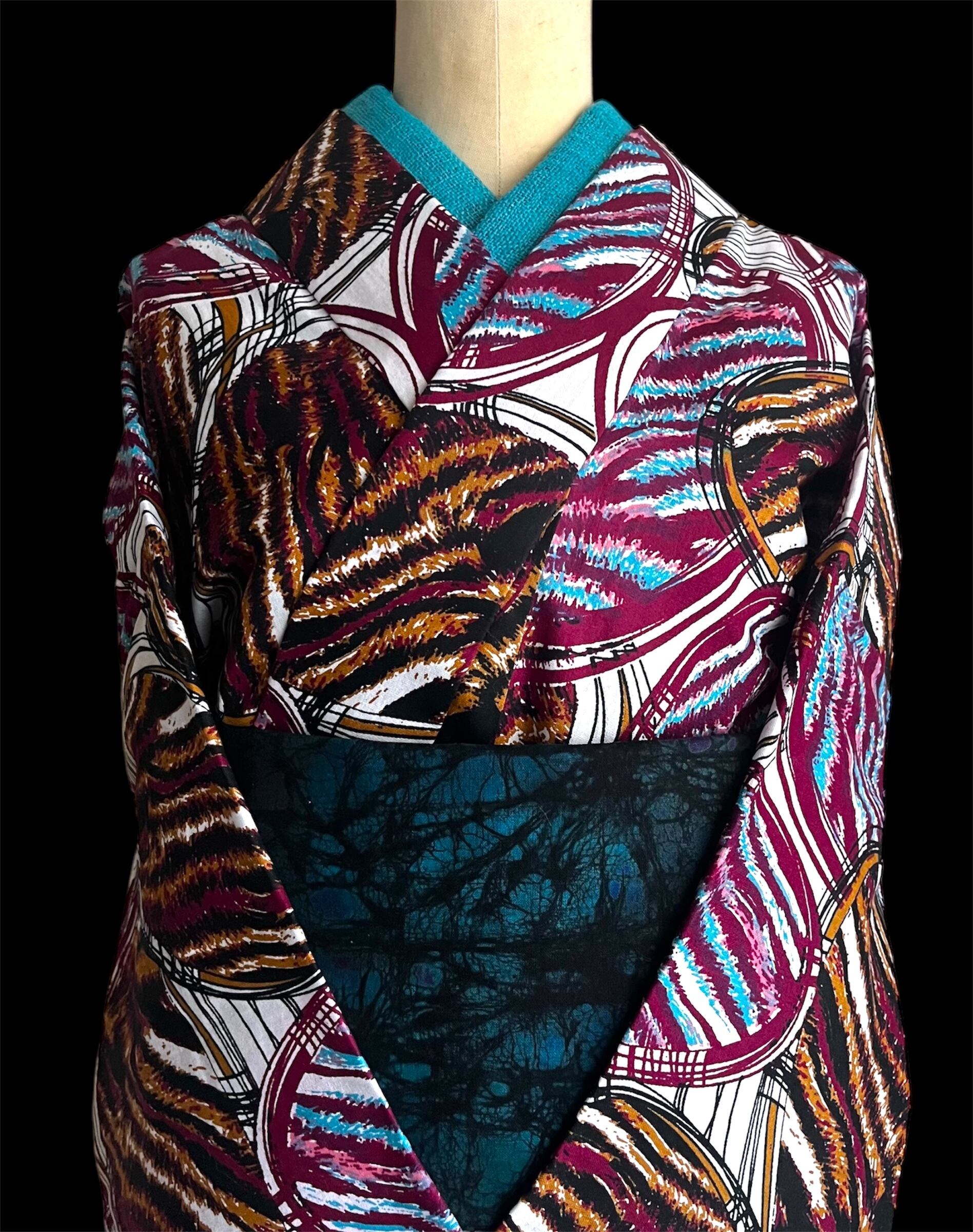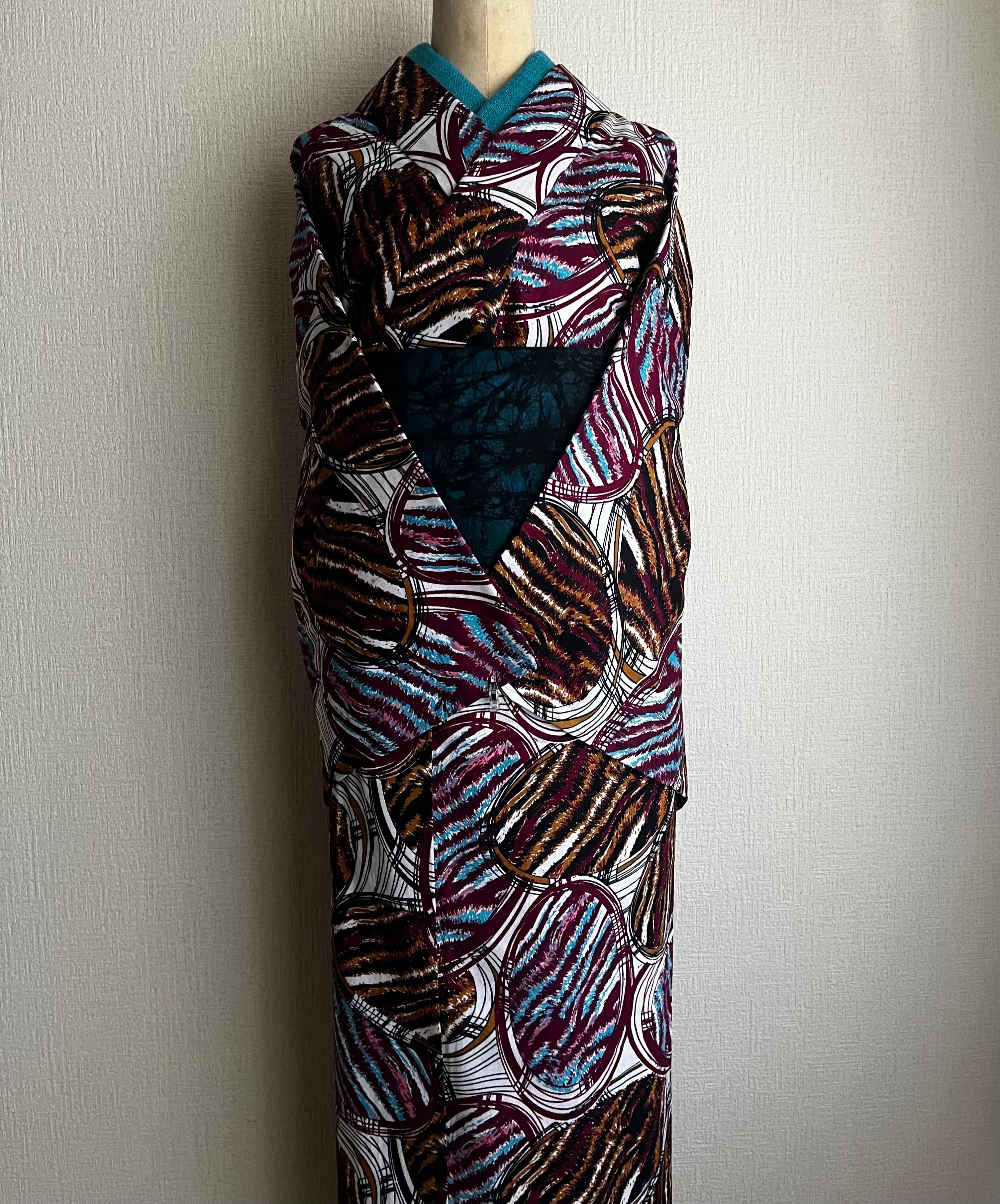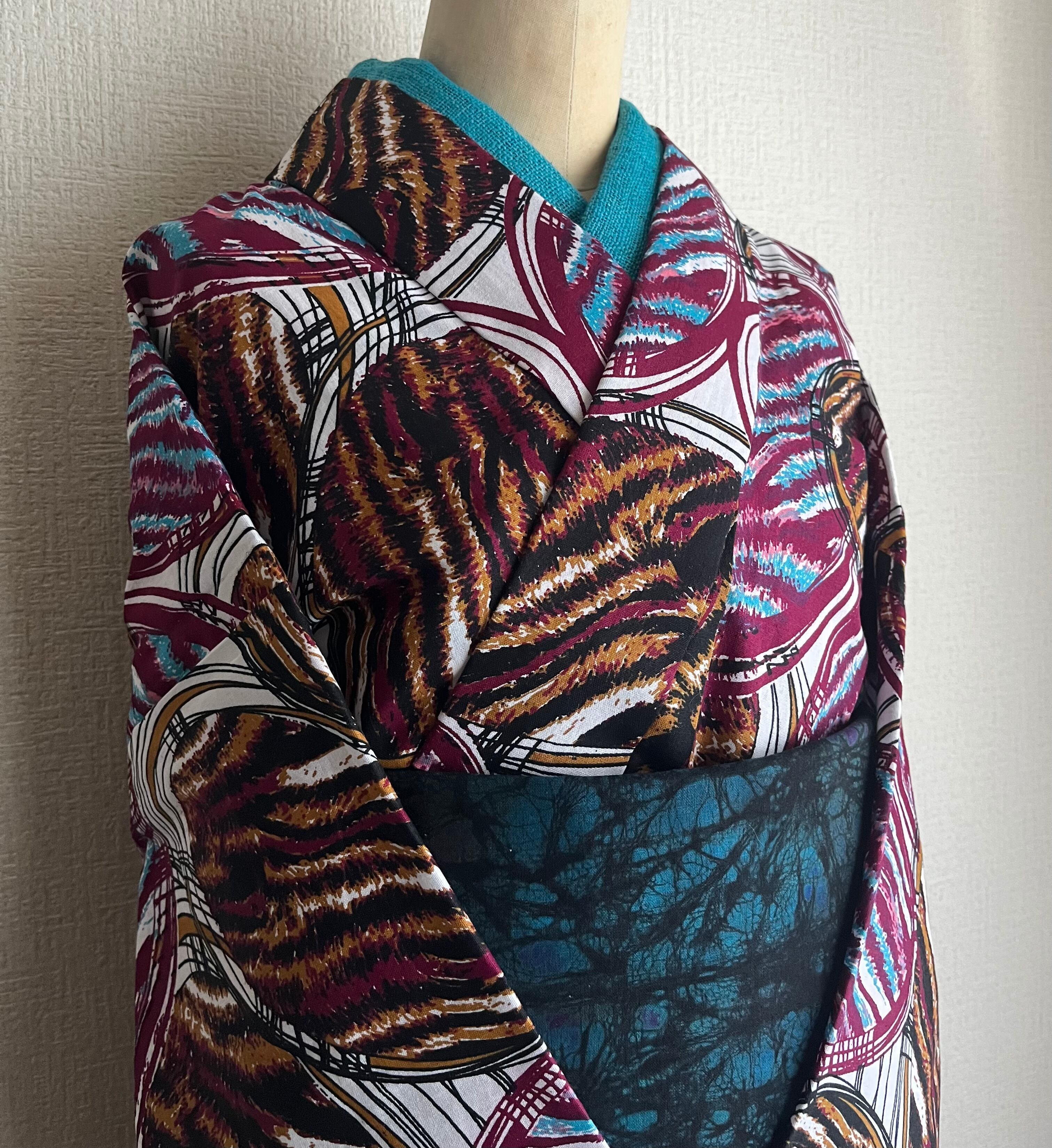 西アフリカ・ガーナのテキスタイルブランドWOODINの生地で仕立てたアクティブラインのアフリカ着物