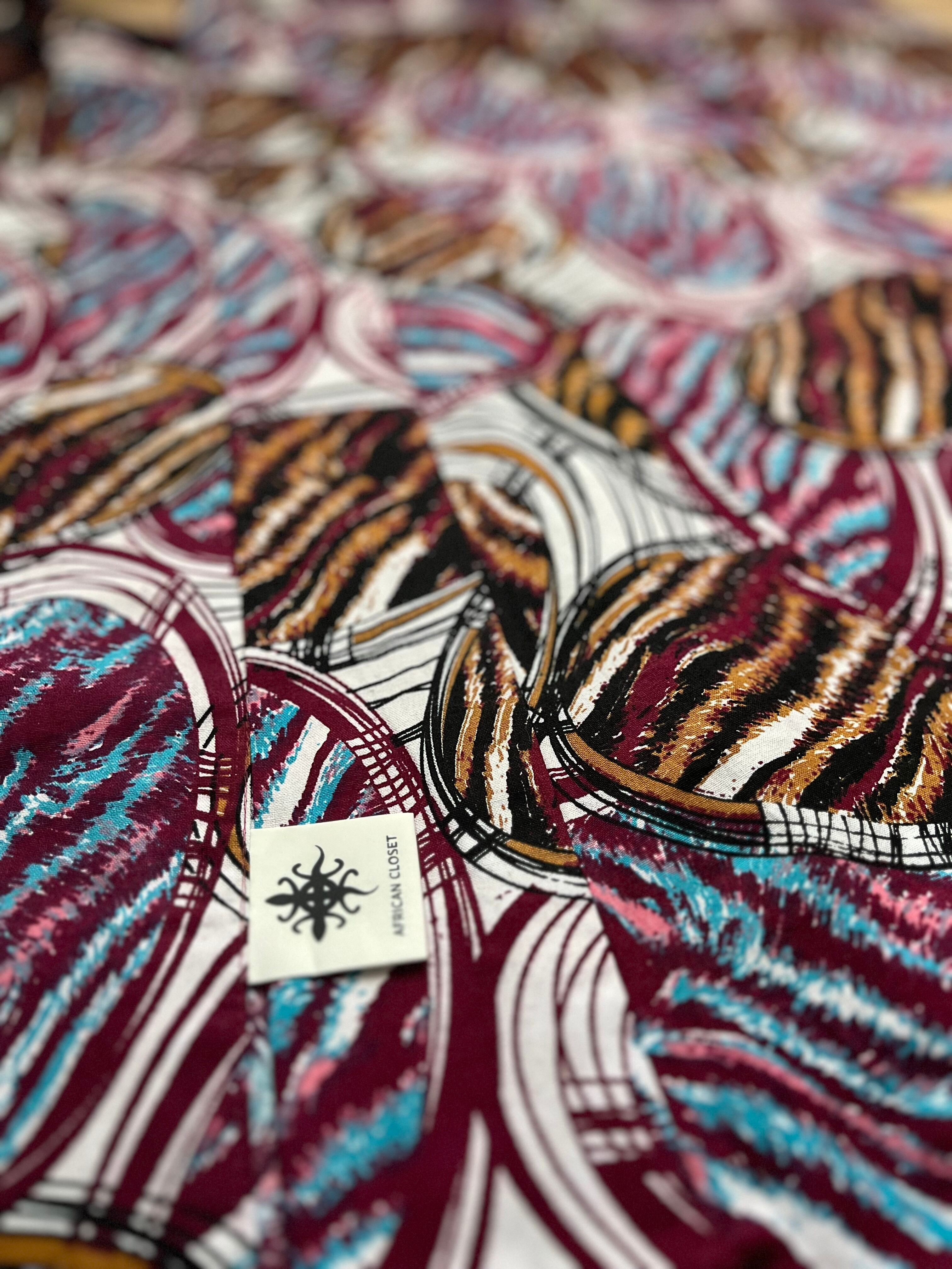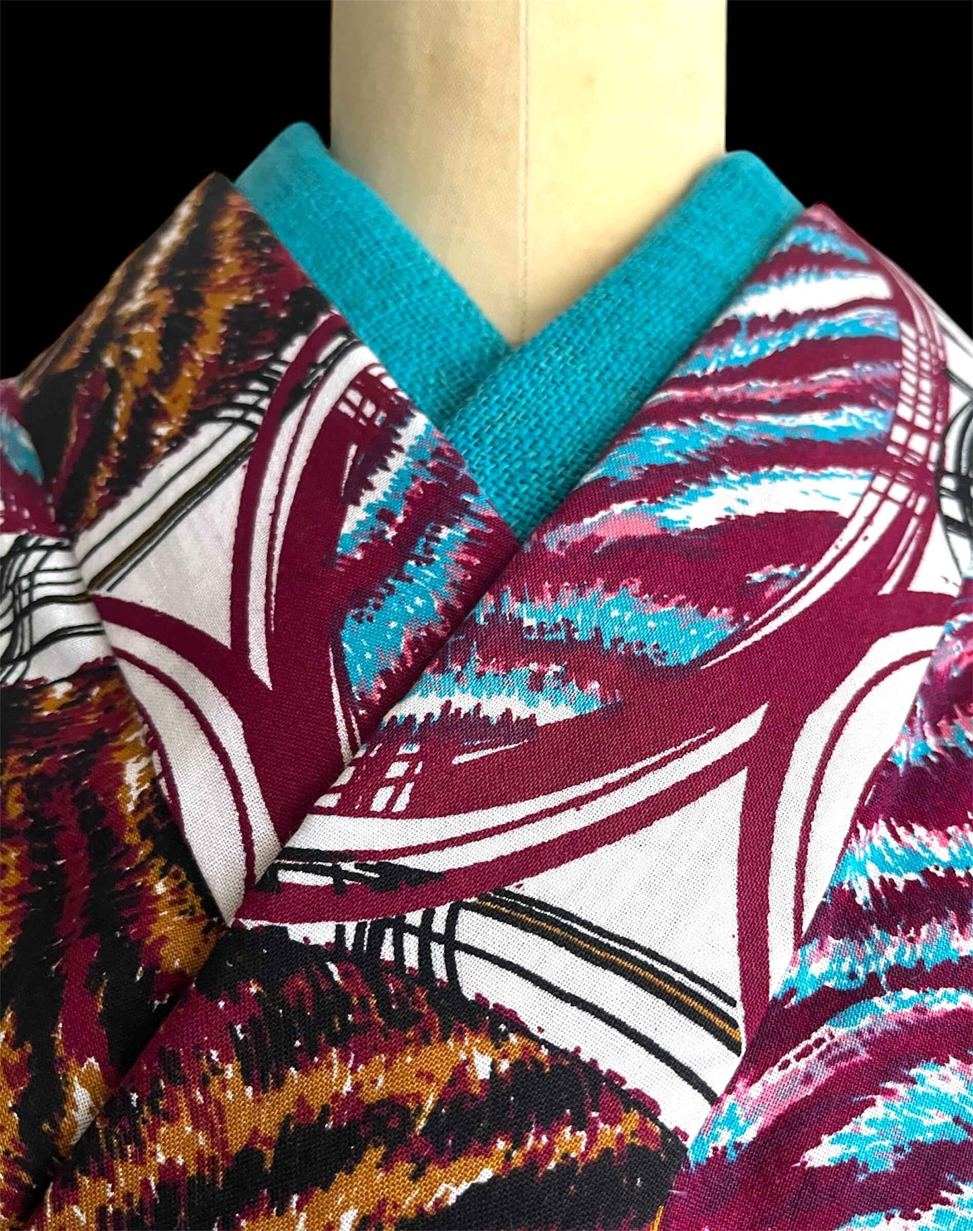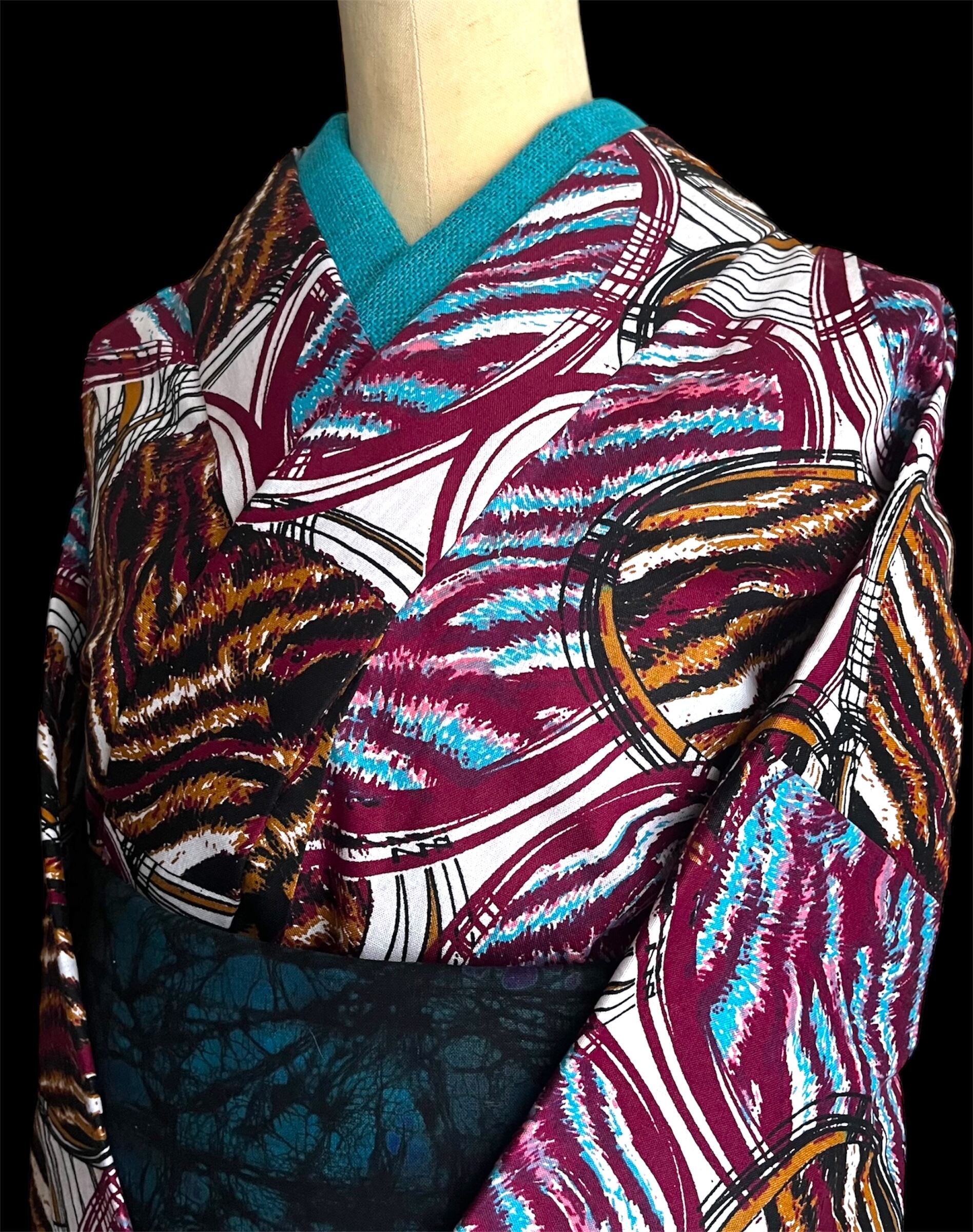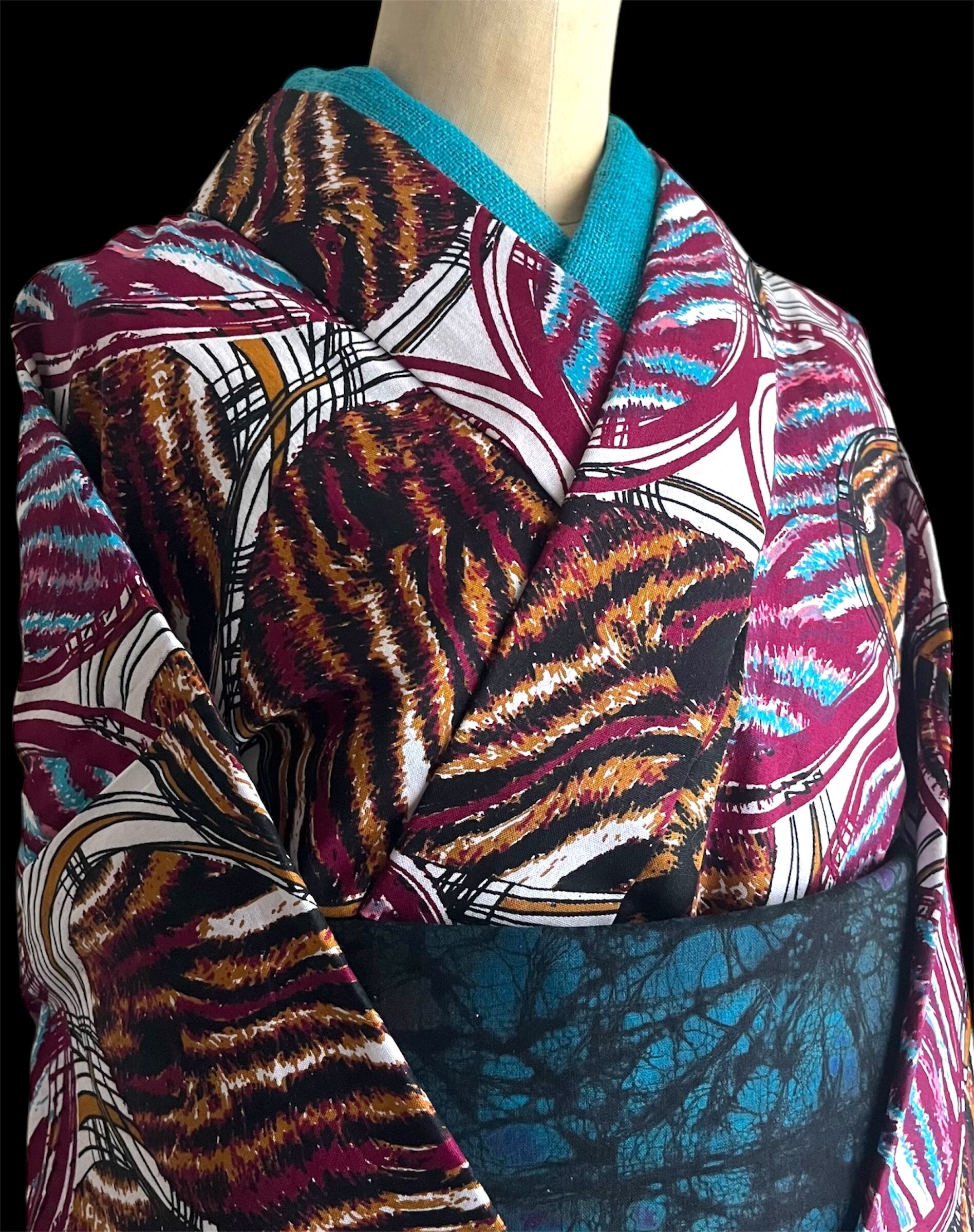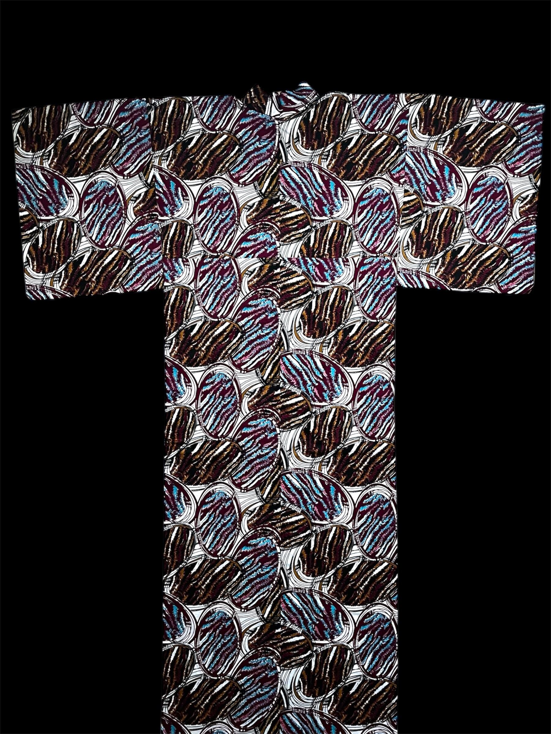 西アフリカ・ガーナのテキスタイルブランドWOODINの生地で仕立てたアクティブラインのアフリカ着物