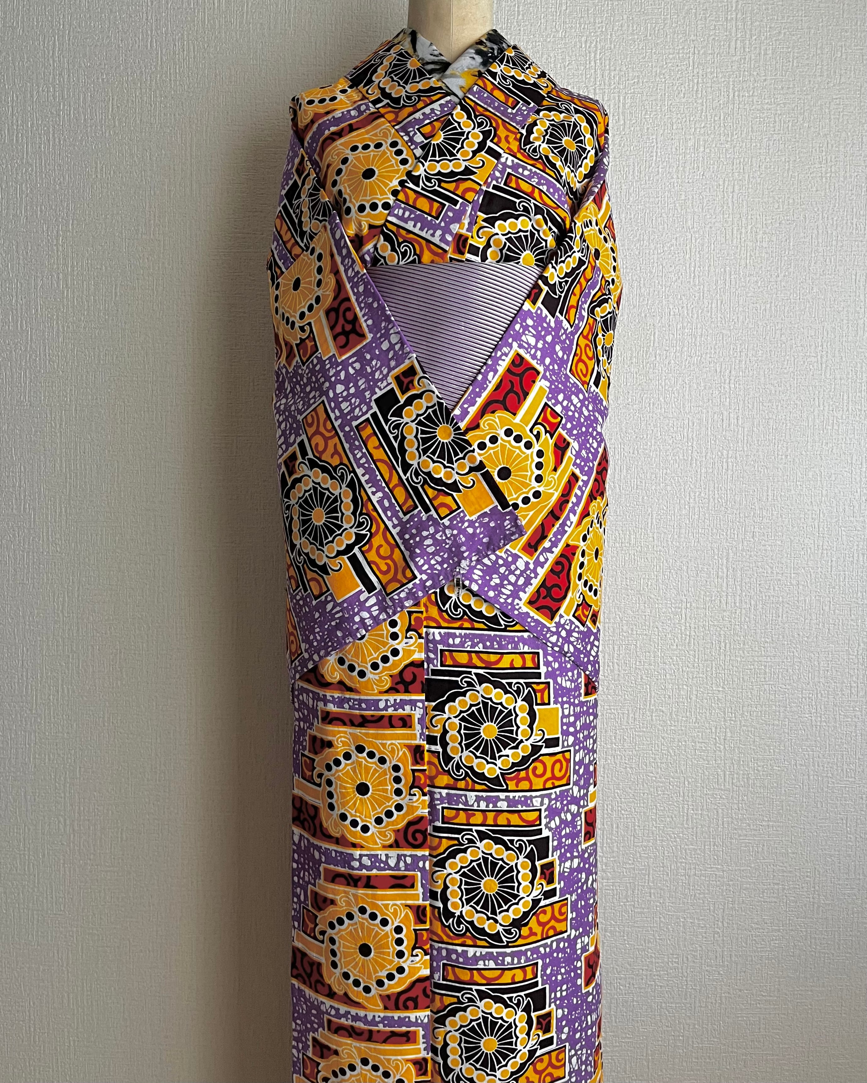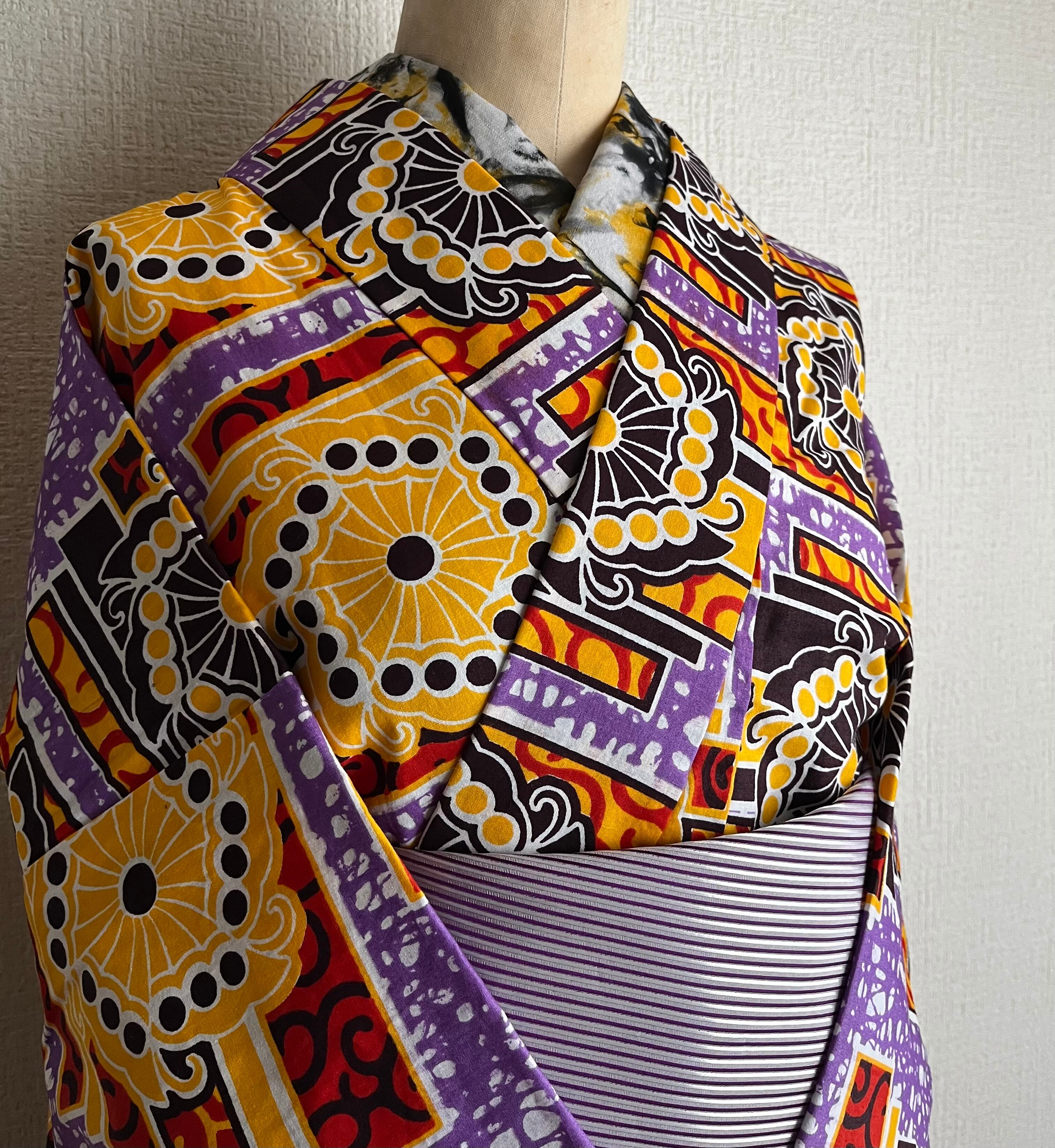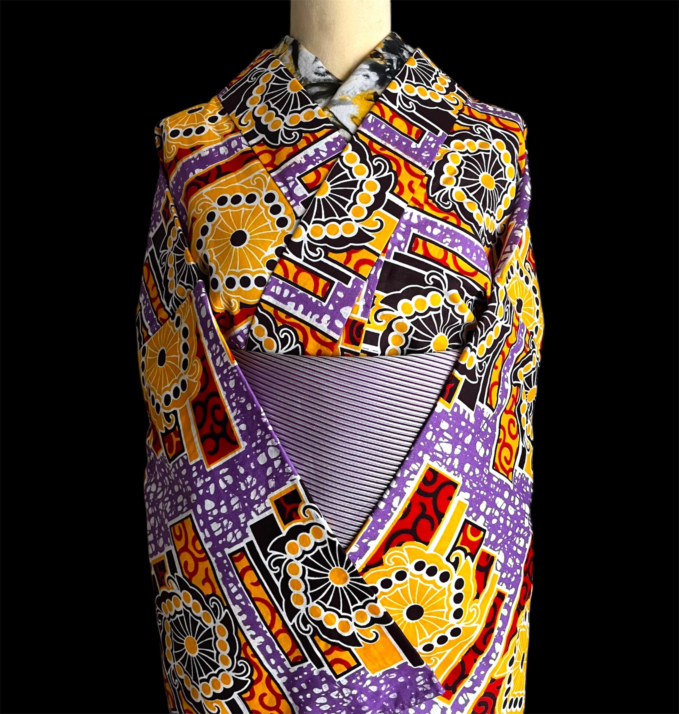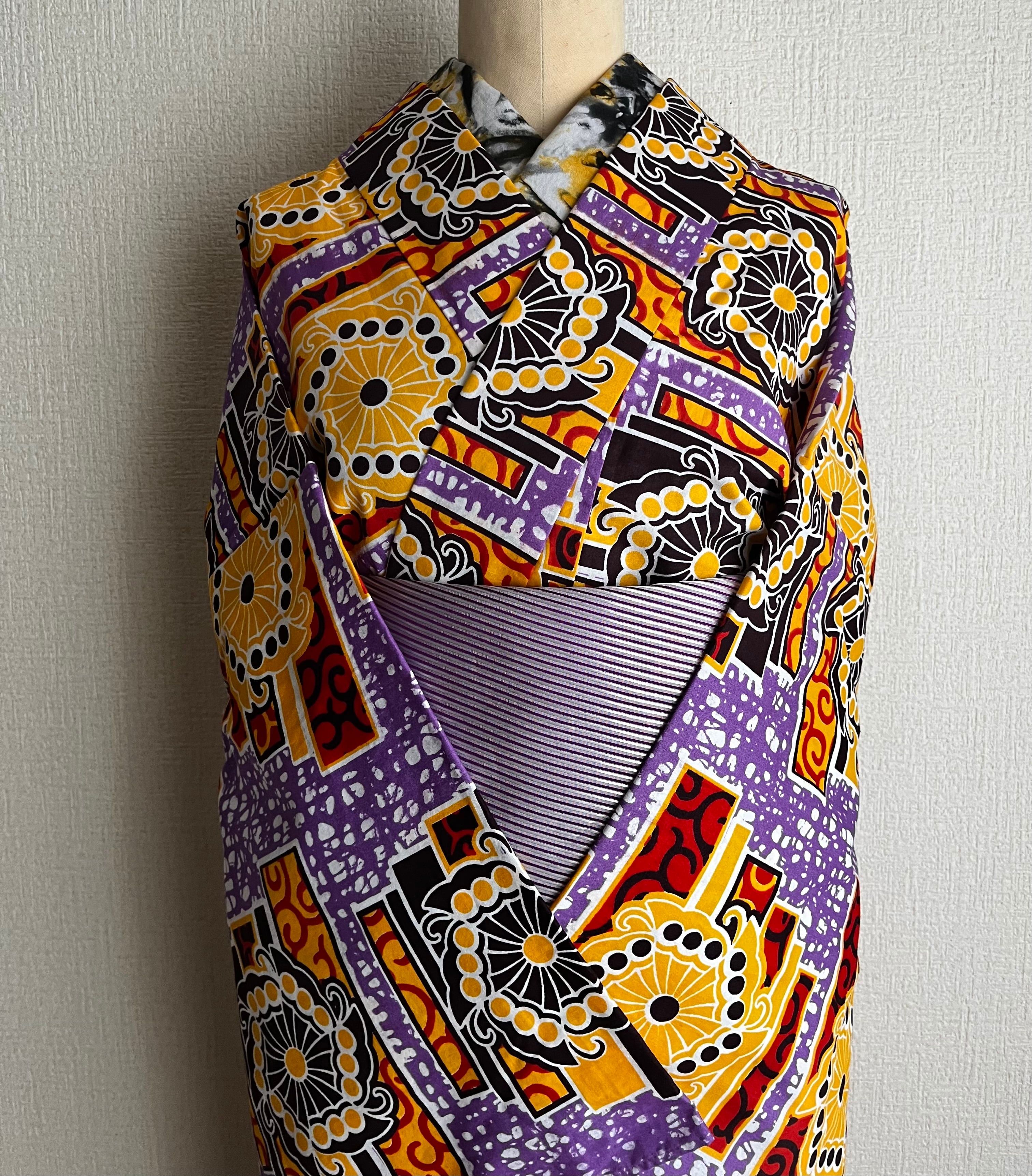 西アフリカ・ガーナのテキスタイルブランドGTP (Ghana Textiles Printing Company Limited)の生地で仕立てたアクティブラインのアフリカ着物