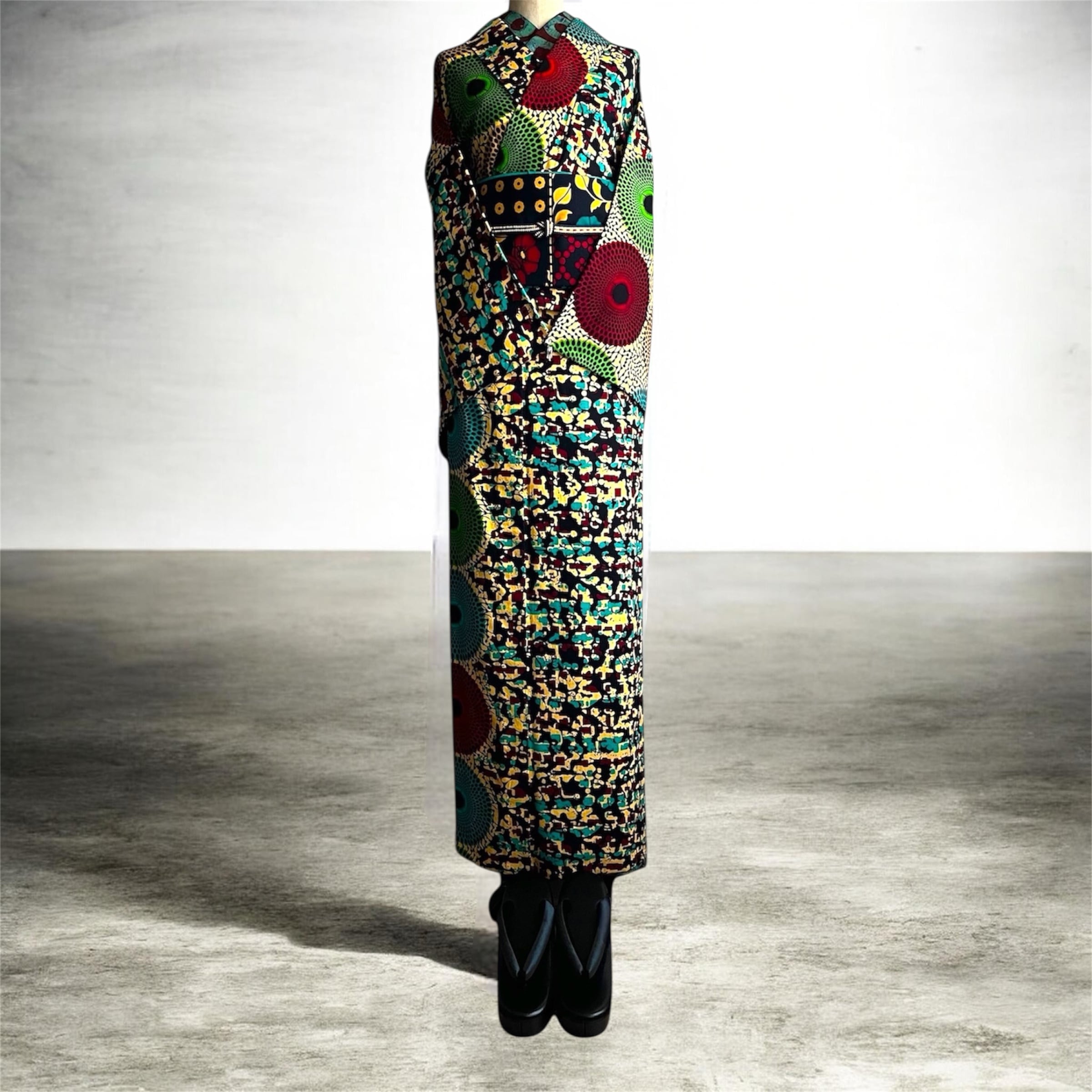 時を越えて愛されるアフリカンクラシックなサークル柄と迷彩タッチの柄がユニークに響き合うデザインです。多彩な円形モチーフが着物全体にそっと溶け込む、遊び心ある大人のアフリカ着物に仕立てました。