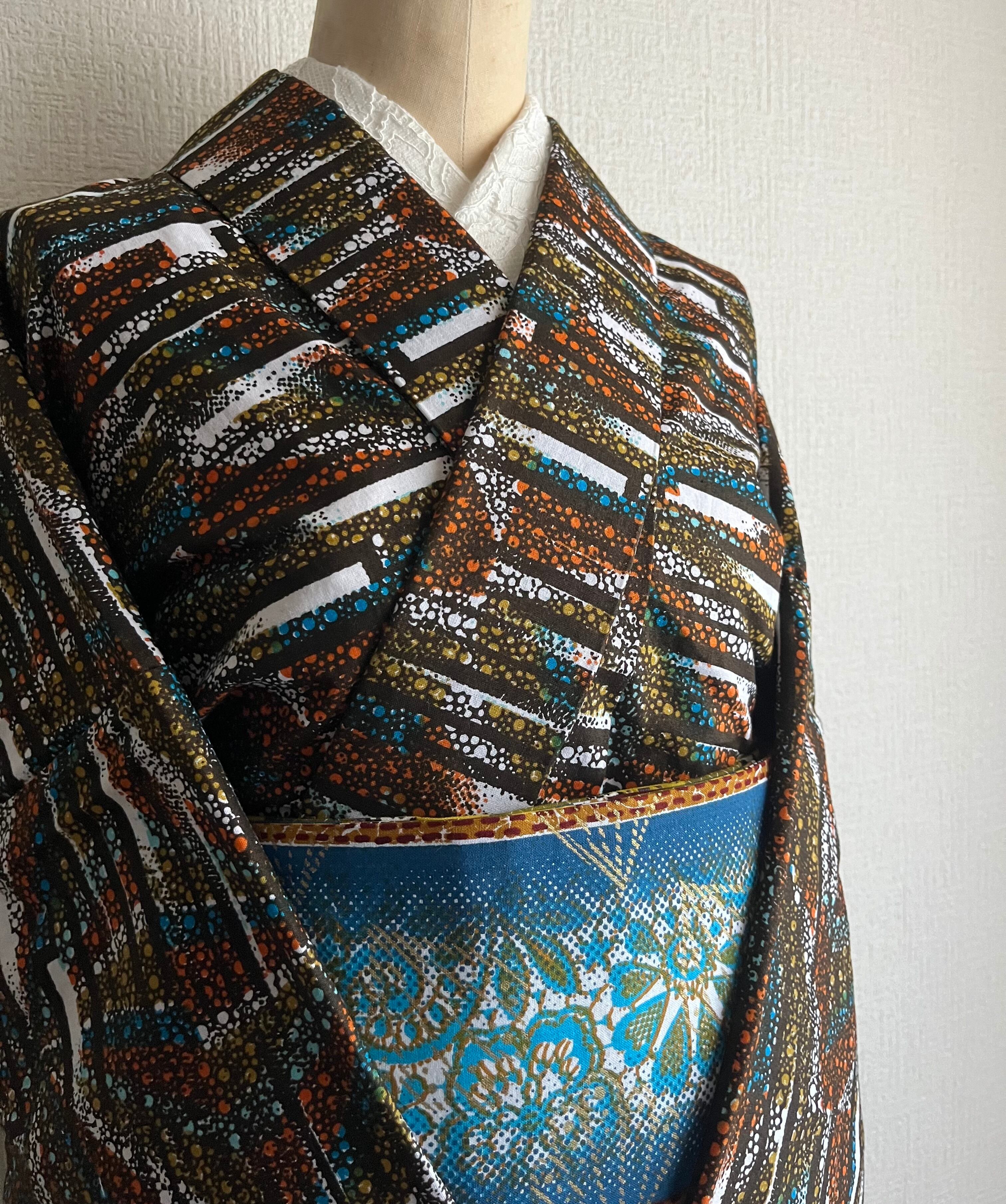西アフリカ・ガーナのテキスタイルブランドWOODIN (ウッディン)の生地でお仕立てしたプレタ着物