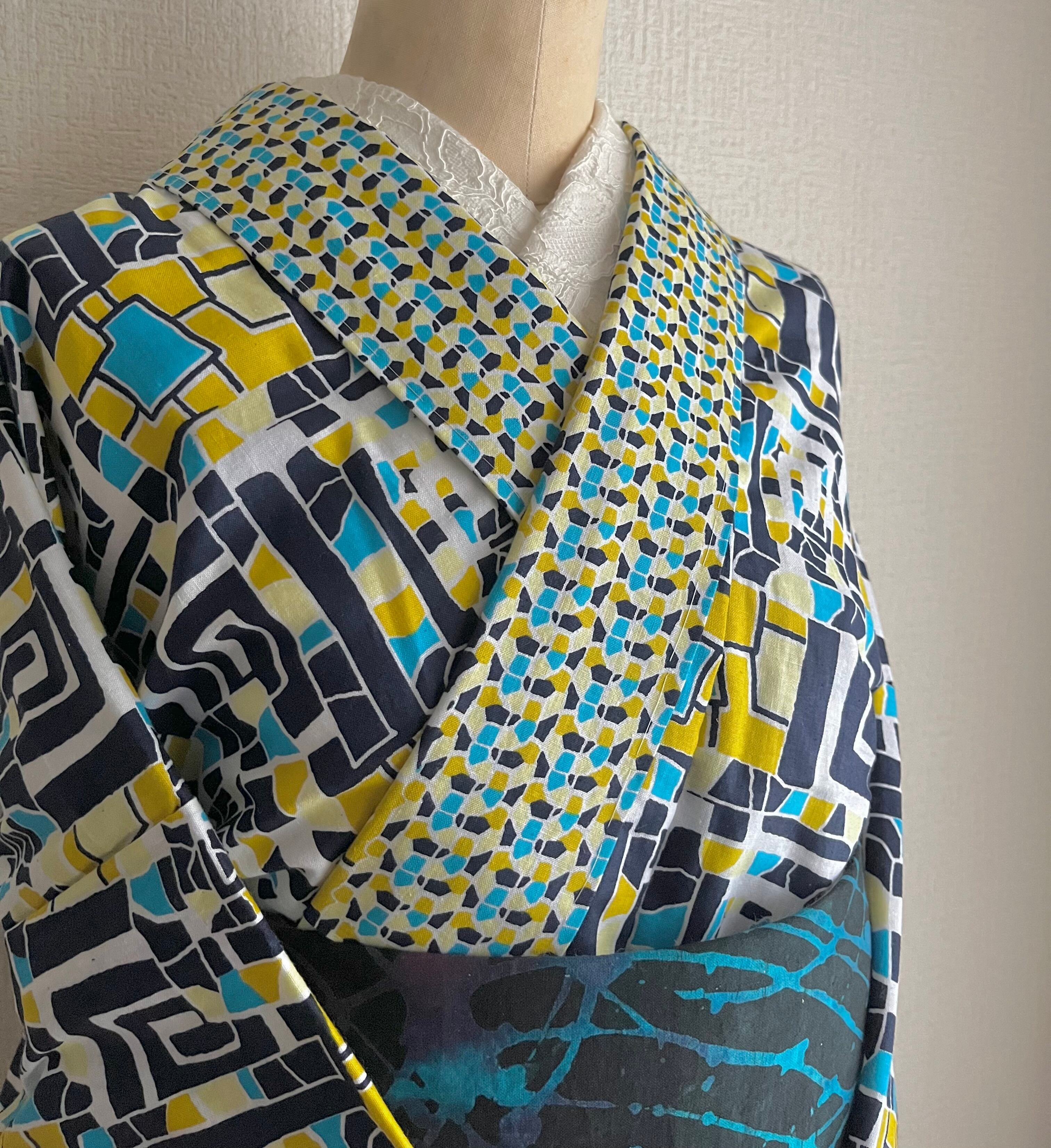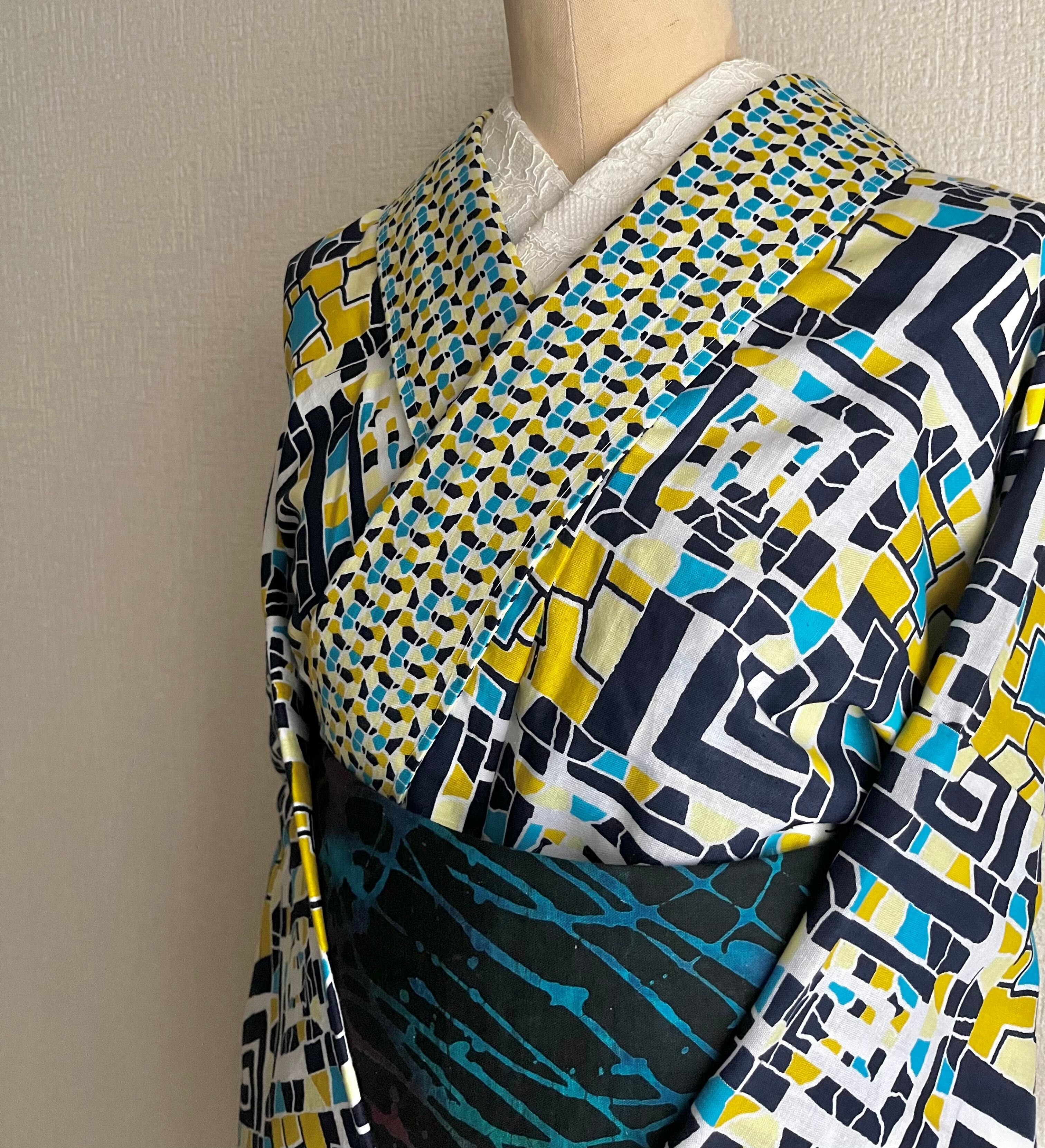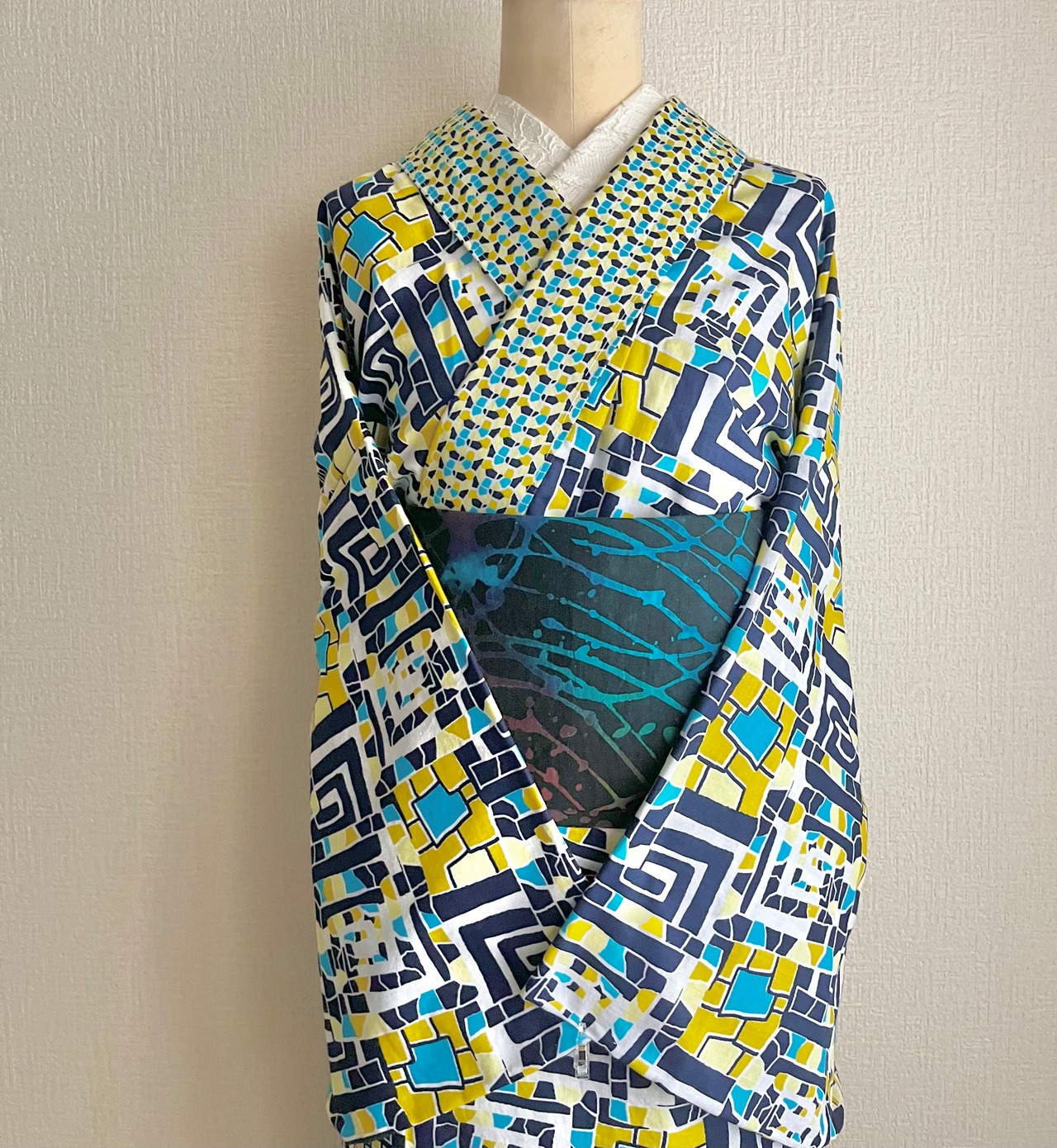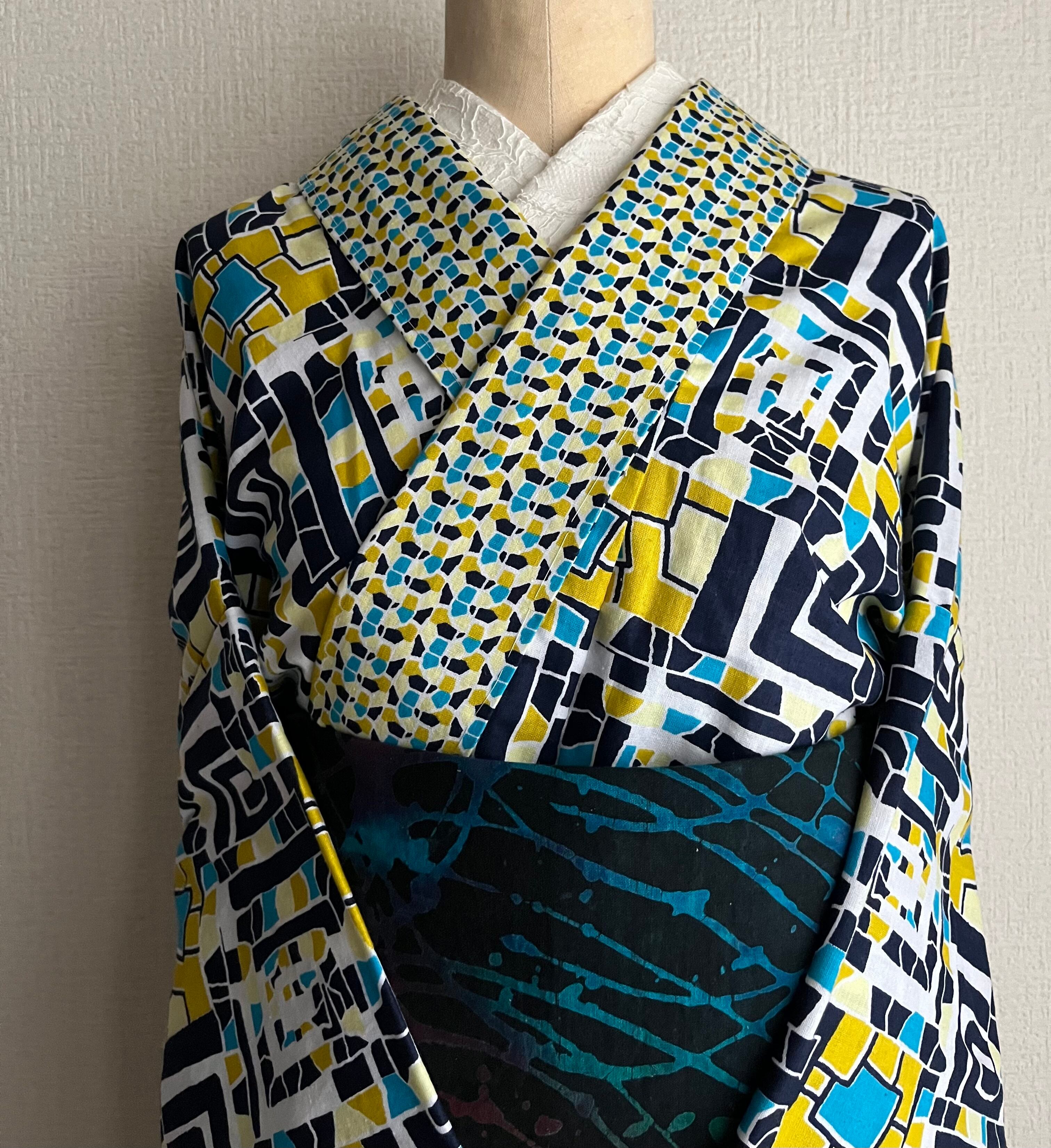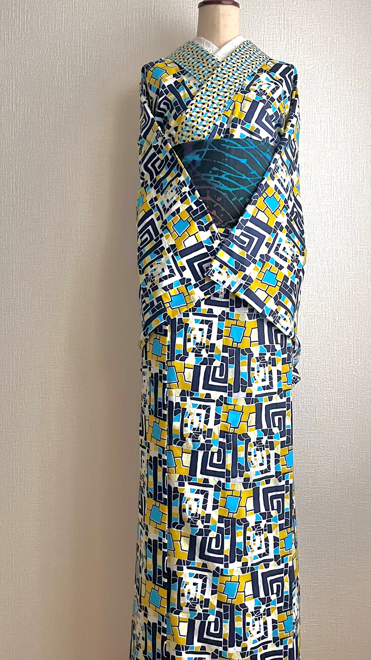 西アフリカ・ガーナのテキスタイルブランドWOODIN (ウッディン)の生地でお仕立てしたプレタ着物