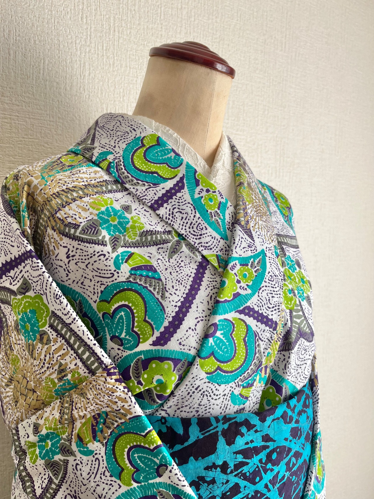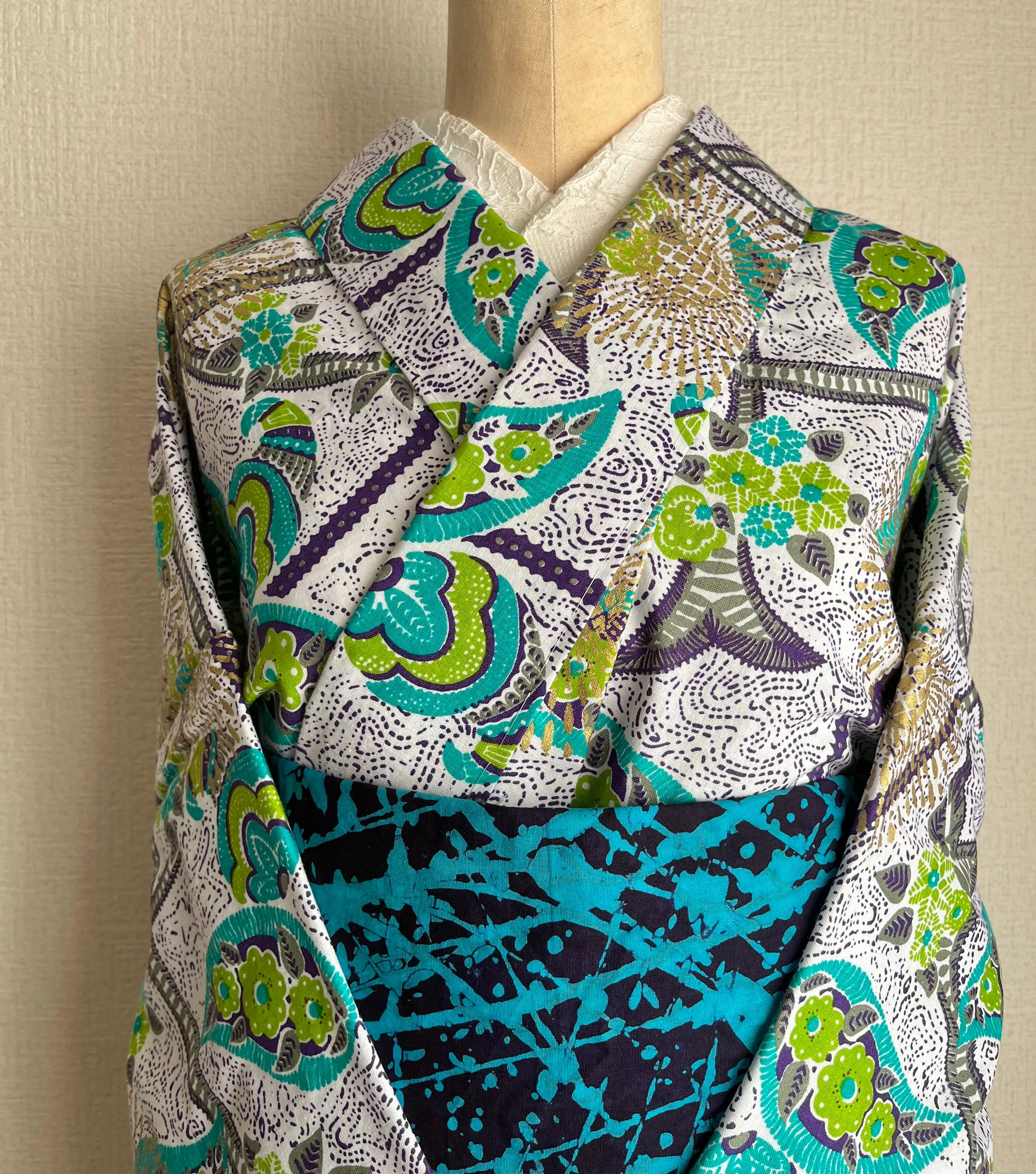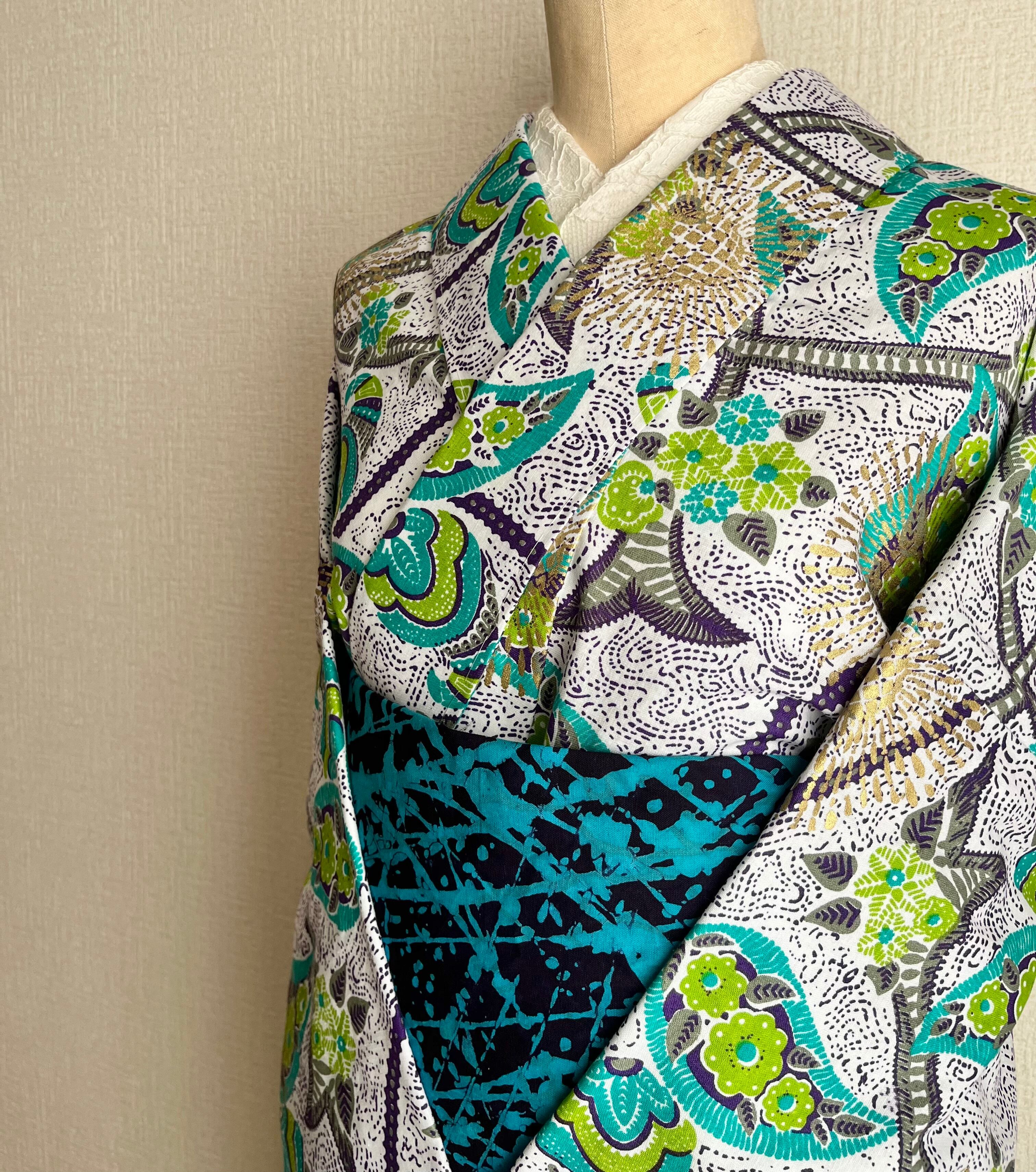 西アフリカ・ガーナのテキスタイルブランドWOODIN (ウッディン)の生地でお仕立てしたプレタ着物